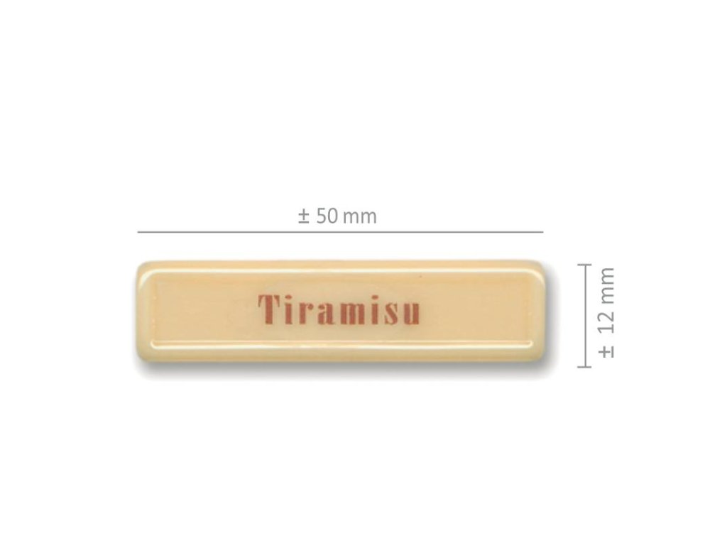 Prémiová bílá čokoládová dekorace s potiskem „Tiramisu“, určená pro profesionální cukrářské použití. Čistý obdélníkový tvar a precizní potisk dodávají dezertům moderní a jednotný vzhled. Obsah kakaové sušiny min. 35 %. Není určeno pro maloobchodní prodej