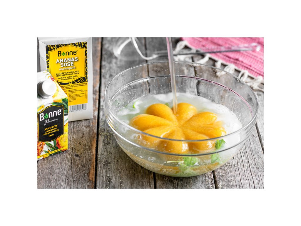 Ovocné pyré Ananas, 1 l je pasterovaný polotovar vyrobený ze 100 % ananasu. Neobsahuje konzervační látky, přidaná sladidla ani aditiva a je vhodný i pro veganskou výživu. Díky šetrnému zpracování si pyré zachovává přirozenou barvu, chuť a aroma čerstvého ananasu a má homogenní konzistenci, ideální pro potravinářskou výrobu a gastronomii.