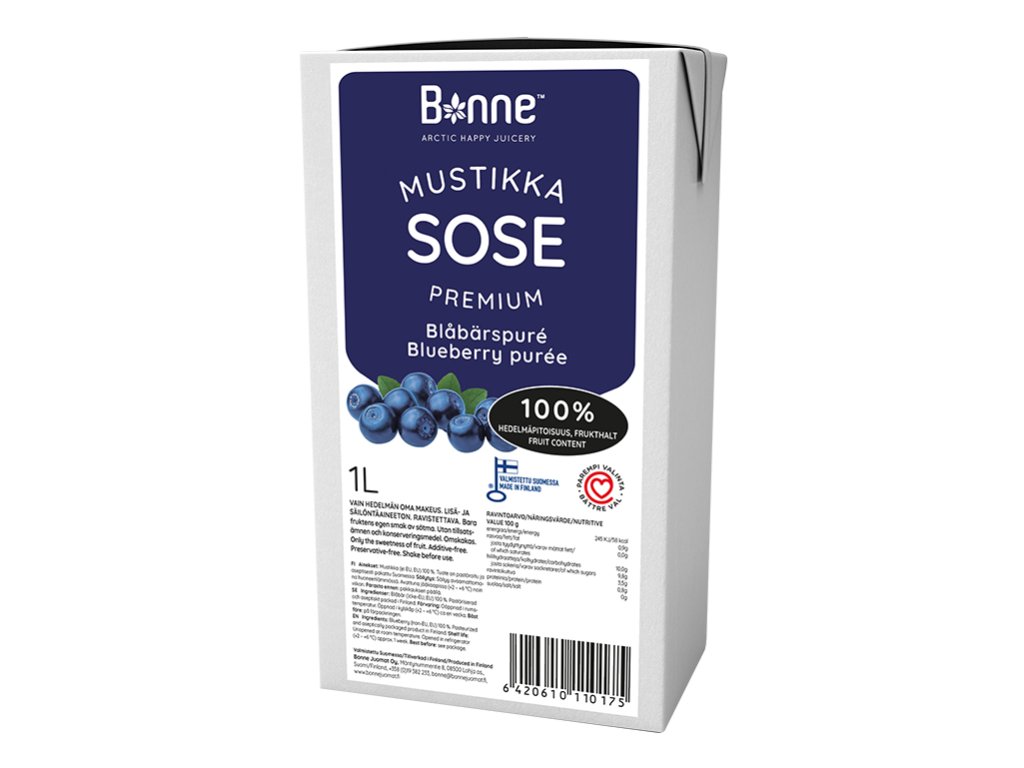 Ovocné pyré Borůvka, 1 l je pasterovaný polotovar vyrobený ze 100 % borůvek. Neobsahuje konzervační látky, přidaná sladidla ani aditiva a je vhodný i pro veganskou stravu. Díky šetrnému zpracování si zachovává přirozenou barvu, chuť a vůni čerstvých borůvek a má homogenní konzistenci, která usnadňuje další zpracování.