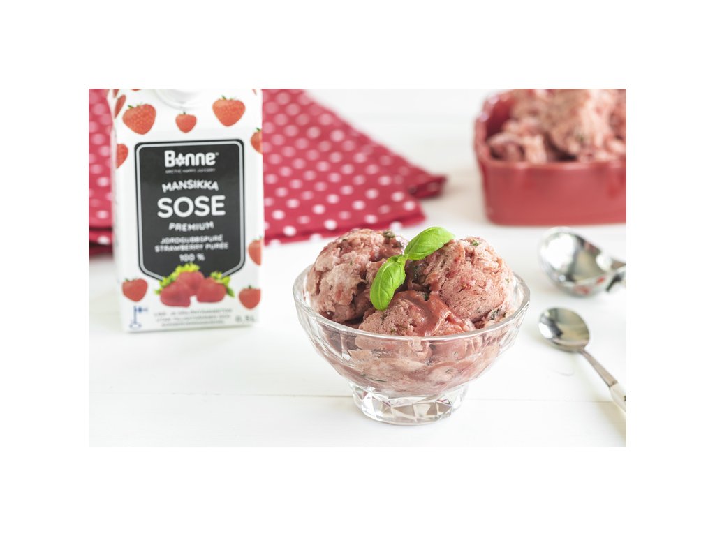 Ovocné pyré Jahoda, 1 l je pasterovaný polotovar vyrobený z jahod a koncentrátu jahodové šťávy. Neobsahuje konzervační látky, přidaná sladidla ani aditiva a je vhodný i pro veganskou výživu. Pyré si zachovává přirozenou chuť, barvu a vůni čerstvých jahod, má homogenní konzistenci a je snadno zpracovatelné v gastronomii i potravinářské výrobě.
