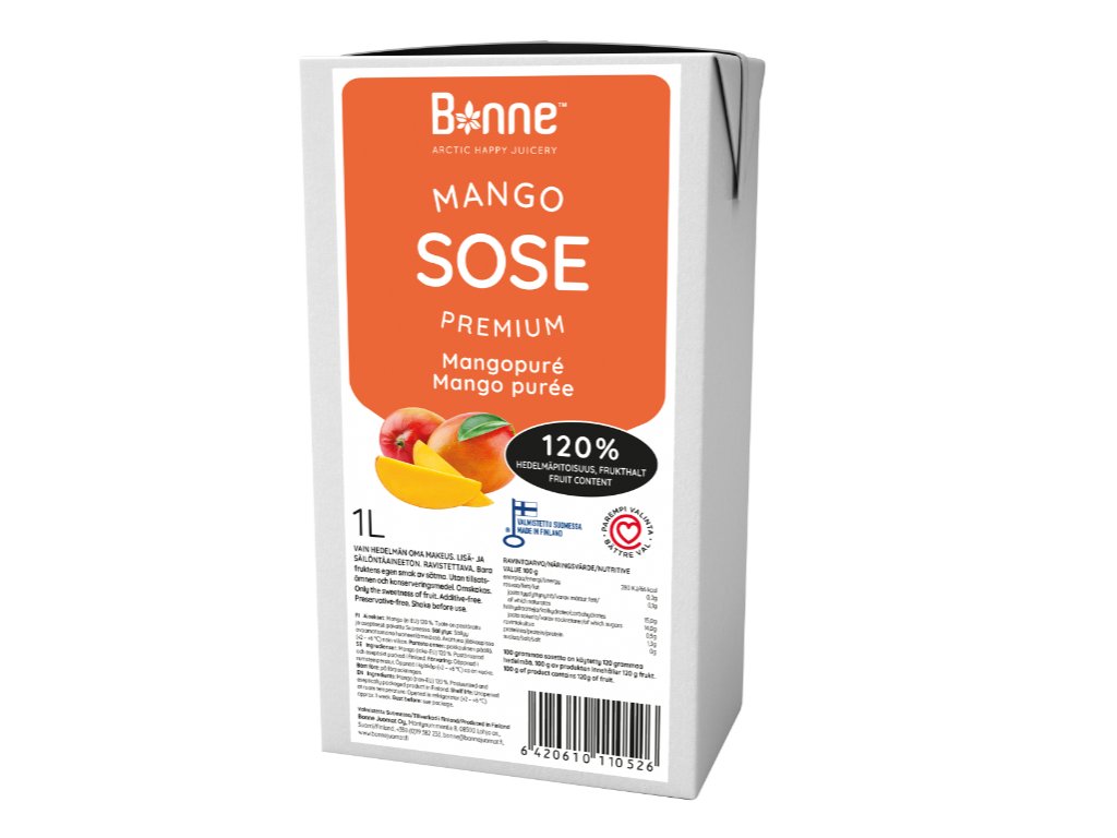 Ovocné pyré Mango, 1 l je pasterovaný polotovar vyrobený ze 100% manga. Neobsahuje žádné konzervanty, přídavné látky ani přidaná sladidla a je vhodný i pro veganskou stravu. Díky šetrnému zpracování si pyré zachovává přirozenou barvu, chuť a vůni zralého manga.