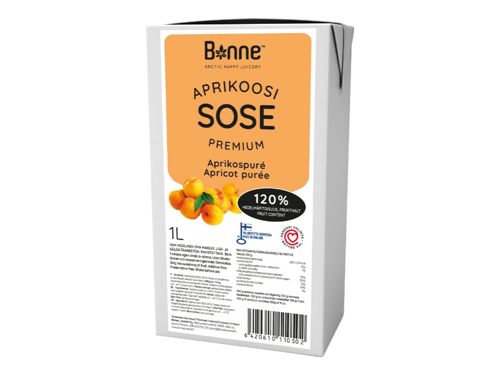Ovocné pyré Meruňka, 1 l je pasterovaný polotovar vyrobený ze 100 % meruněk. Neobsahuje žádné konzervační látky, přidaná sladidla ani aditiva a je vhodný i pro veganskou výživu. Díky šetrnému zpracování si pyré uchovává přirozenou barvu, chuť a vůni zralých meruněk a má homogenní konzistenci pro snadné použití v potravinářské výrobě.